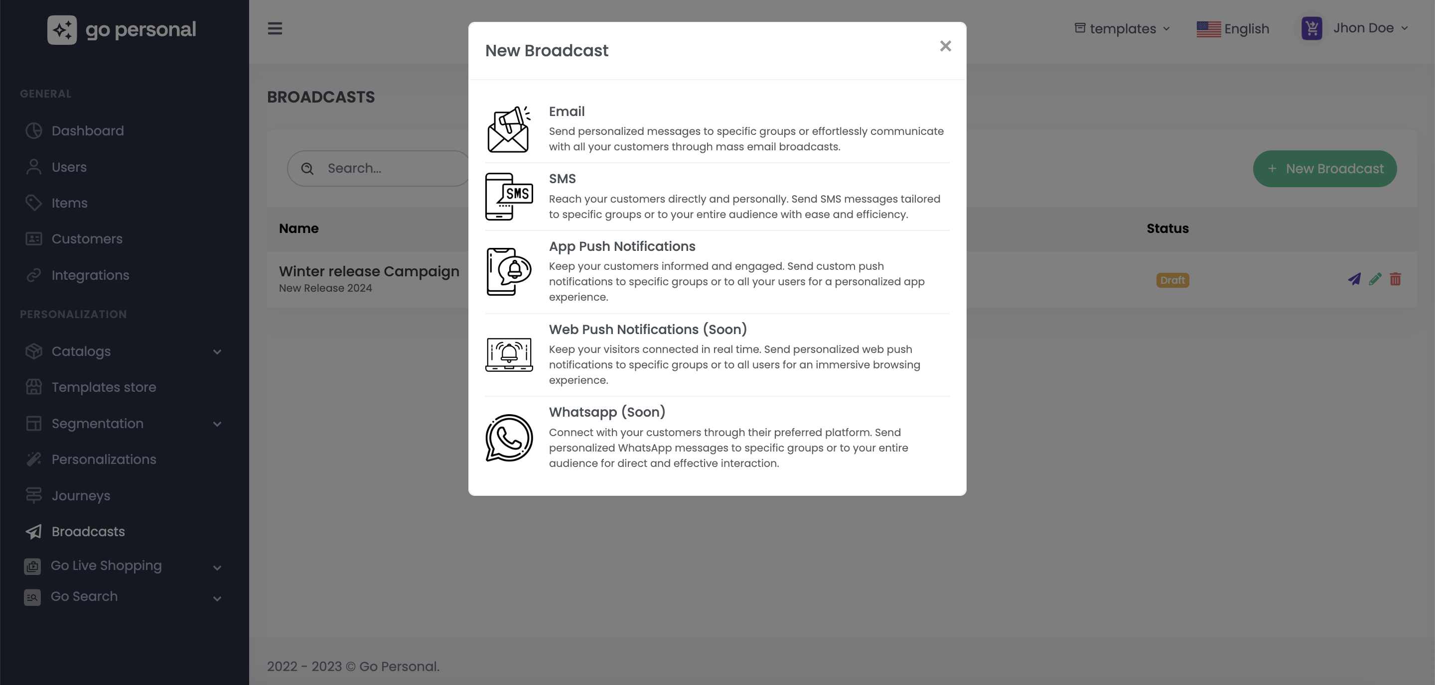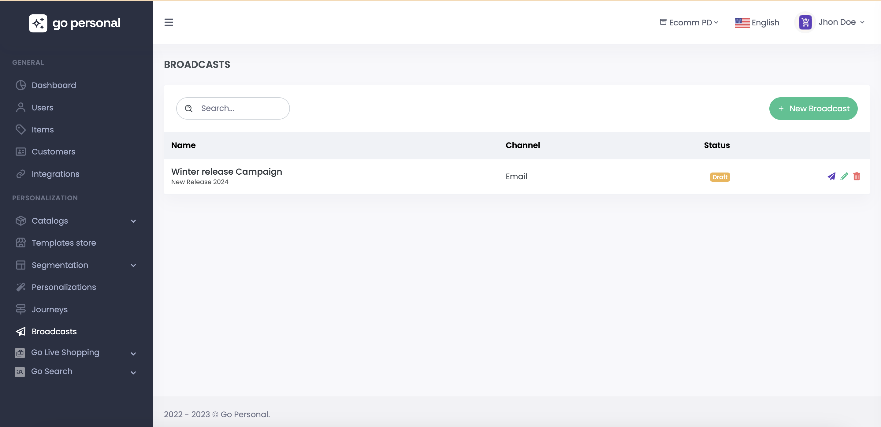 Here, you can access the list of created broadcasts. Each broadcast is displayed with its corresponding status and channel.