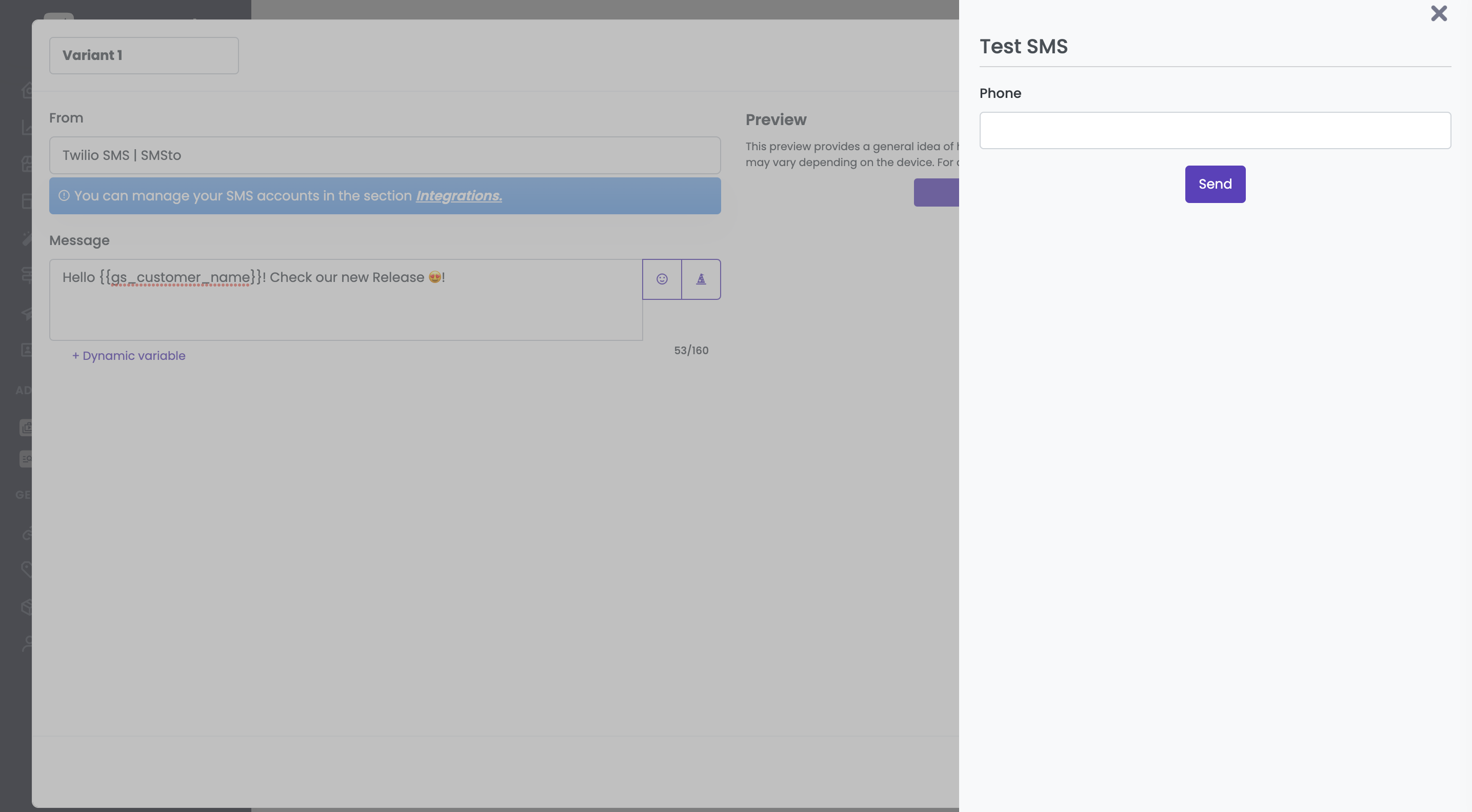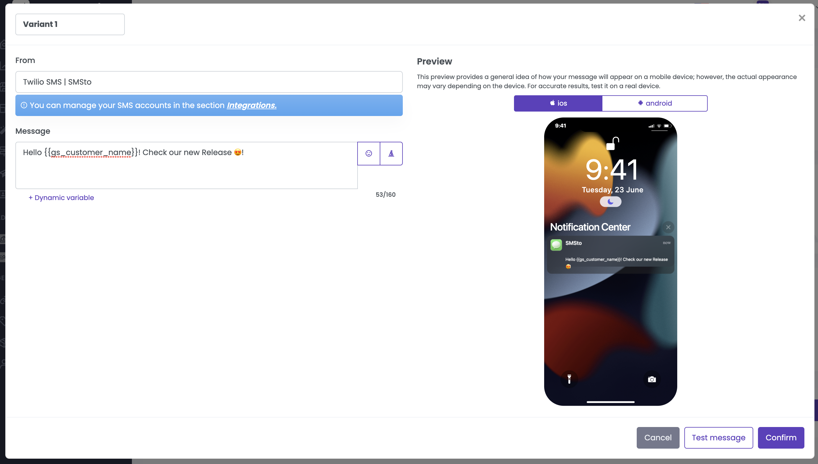 Customize the variant by selecting the sender's account.  If you haven't configured your sms channel channel yet, you can do so in the "[Integrations](https://academy.gopersonal.ai/en/admin-ui/integrations)" section of the platform.&#x20;