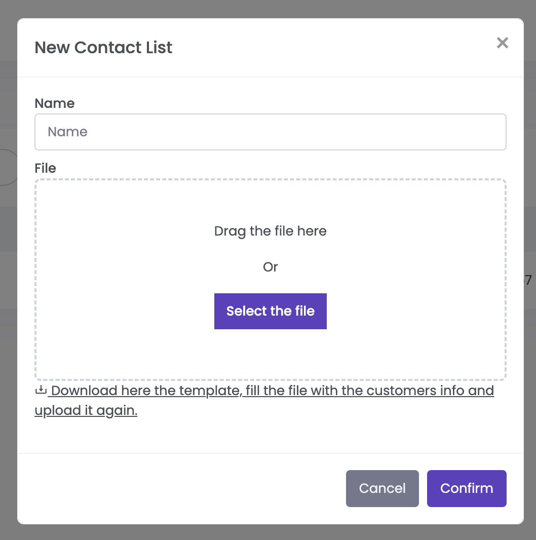 To create a contact list, it is necessary to provide a name and upload a file containing the list of clients to import.