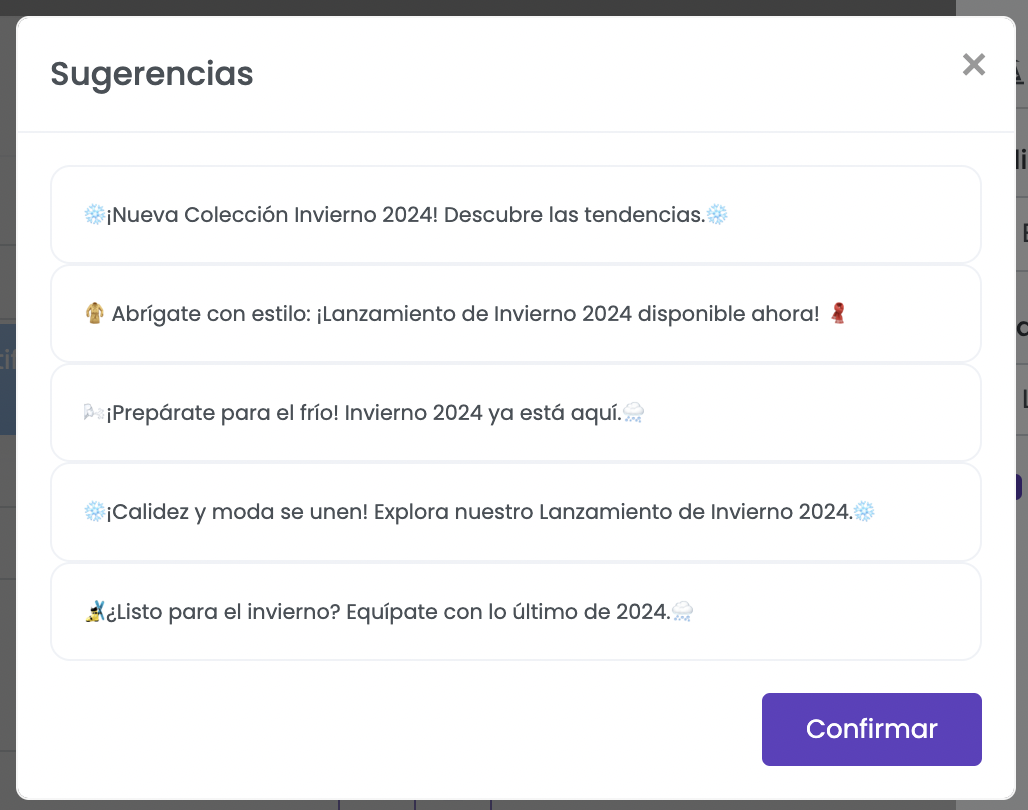 La plataforma generará sugerencias de texto contextuales para el campo y canal deseado, como el título de una notificación push o el cuerpo de un SMS.&#x20;
