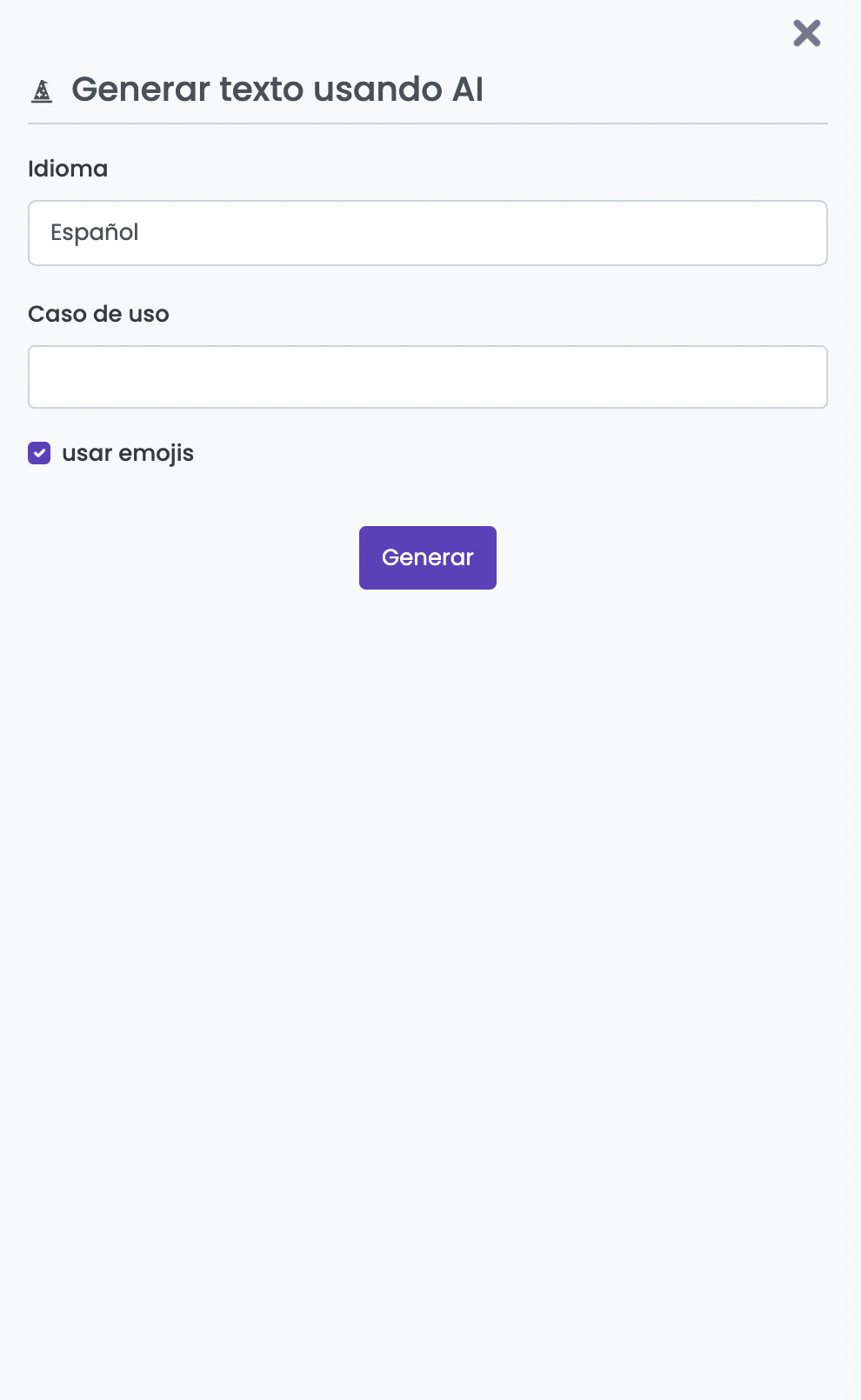 Al presionar el botón <img src="https://1714366366-files.gitbook.io/~/files/v0/b/gitbook-x-prod.appspot.com/o/spaces%2FuYUYzfG5fXW0akjkg1XQ%2Fuploads%2FyxgCApW1h1T7tjh9h5jS%2Fimage.png?alt=media&#x26;token=d1ca4ab2-50b2-4024-abb4-d1acb719019b" alt="" data-size="line"> se accede a un formulario para ingresar el idioma, proporcionar una breve descripción del caso de uso y optar por incluir emojis en el texto.