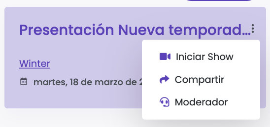 Presionando ![](https://1714366366-files.gitbook.io/~/files/v0/b/gitbook-x-prod.appspot.com/o/spaces%2FuYUYzfG5fXW0akjkg1XQ%2Fuploads%2FAsIpCEYJN7Ku25m04P5M%2FScreenshot%202023-02-09%20at%2012.03.23.png?alt=media\&token=1ffa5ce4-df06-4e6a-8dc9-8a3841164f2e) puedes iniciar el show, compartir el link del show a un invitado o iniciar al moderador. &#x20;