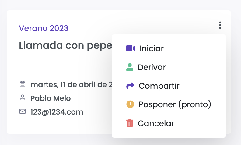 Presionando ![](https://1714366366-files.gitbook.io/~/files/v0/b/gitbook-x-prod.appspot.com/o/spaces%2FuYUYzfG5fXW0akjkg1XQ%2Fuploads%2FAsIpCEYJN7Ku25m04P5M%2FScreenshot%202023-02-09%20at%2012.03.23.png?alt=media\&token=1ffa5ce4-df06-4e6a-8dc9-8a3841164f2e) puedes iniciar la llamada (o continuar en caso que no esté finalizada), compartir el link al invitado (Copiar), derivar a otro host que tenga disponibilidad o cancelar el evento.&#x20;