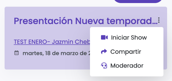 Presionando <img src="https://1714366366-files.gitbook.io/~/files/v0/b/gitbook-x-prod.appspot.com/o/spaces%2FuYUYzfG5fXW0akjkg1XQ%2Fuploads%2FxCRgcQmbC8XvZP6loYKV%2FScreenshot%202025-03-18%20at%2010.47.12%E2%80%AFAM.png?alt=media&#x26;token=6abb126c-e3bd-4446-9090-6b90eda15caf" alt="" data-size="line"> es posible ver los items agregados a este show. Aquí el host puede mostrar los productos que irán apareciendo a los clientes mirando el show. &#x20;