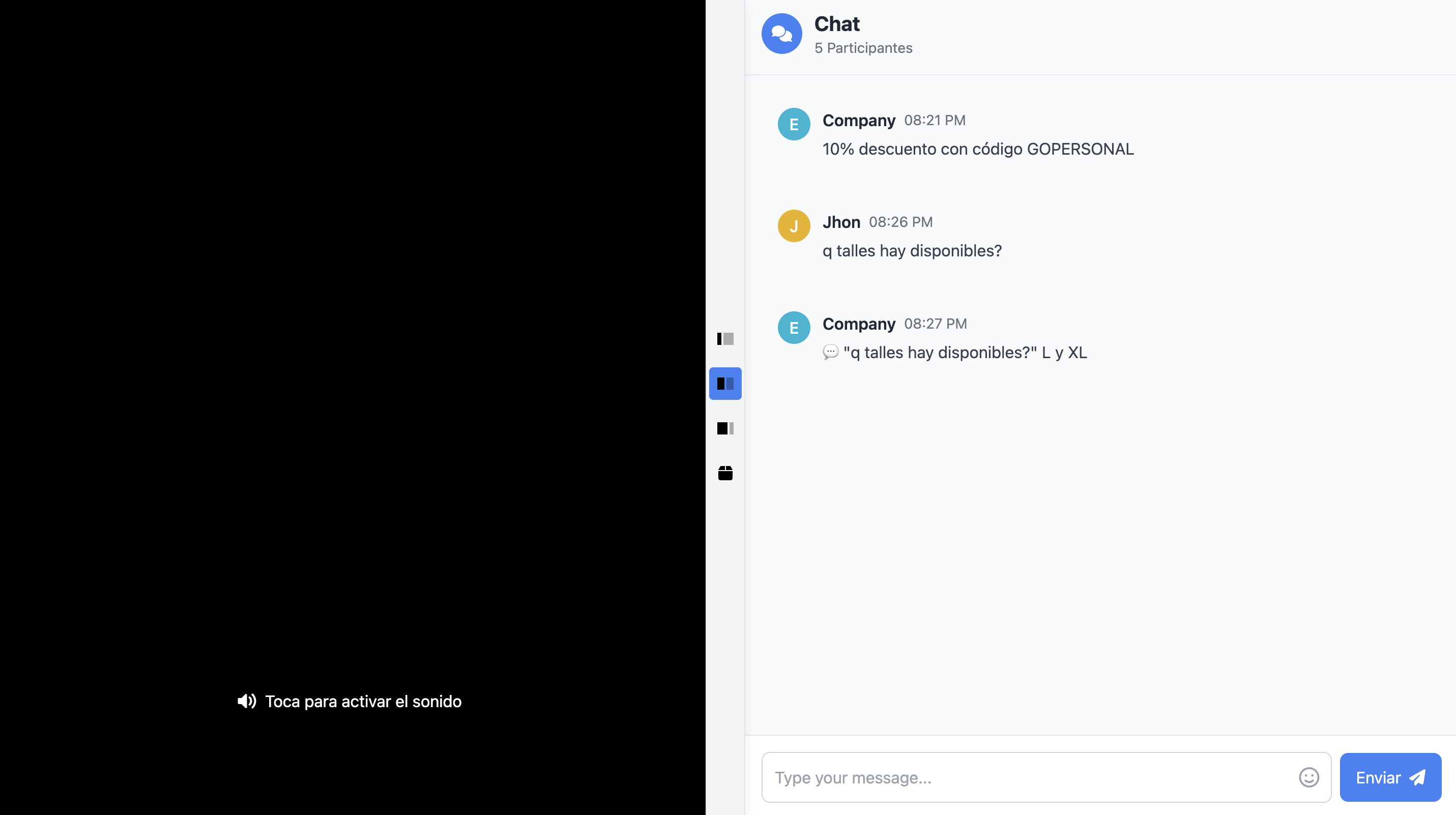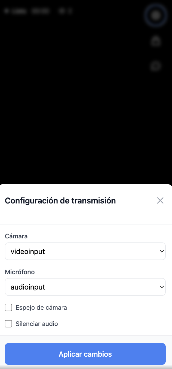 Presionando <img src="https://1714366366-files.gitbook.io/~/files/v0/b/gitbook-x-prod.appspot.com/o/spaces%2FuYUYzfG5fXW0akjkg1XQ%2Fuploads%2FIQOPDbAdNhcjcRzYq9cD%2FScreenshot%202025-03-17%20at%208.06.33%E2%80%AFPM.png?alt=media&#x26;token=8a05e2fb-3fc8-494f-9350-c025e998caec" alt="" data-size="line">  se acceden a las configuraciones. Aquí es posible cambiar la camara y microfono a utilizar, usar espejo de camara y silenciar el audio si no es necesario para el show.