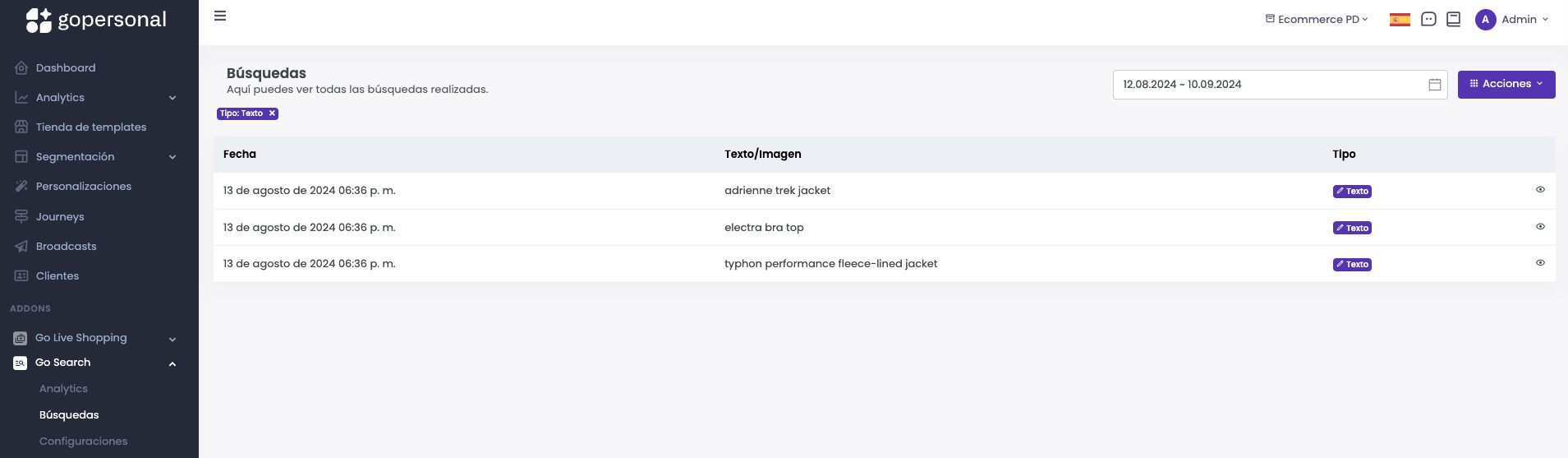 La página de búsquedas proporciona un listado completo de todas las consultas realizadas a través de Go search, abarcando búsquedas por imagen, voz o texto. Este panel centraliza la información sobre las interacciones de búsqueda, mostrando tanto los términos utilizados por los usuarios como los resultados que se han generado. Al acceder a esta página, se obtiene una visión integral de cómo los usuarios están explorando y encontrando productos o servicios en la plataforma.&#x20;