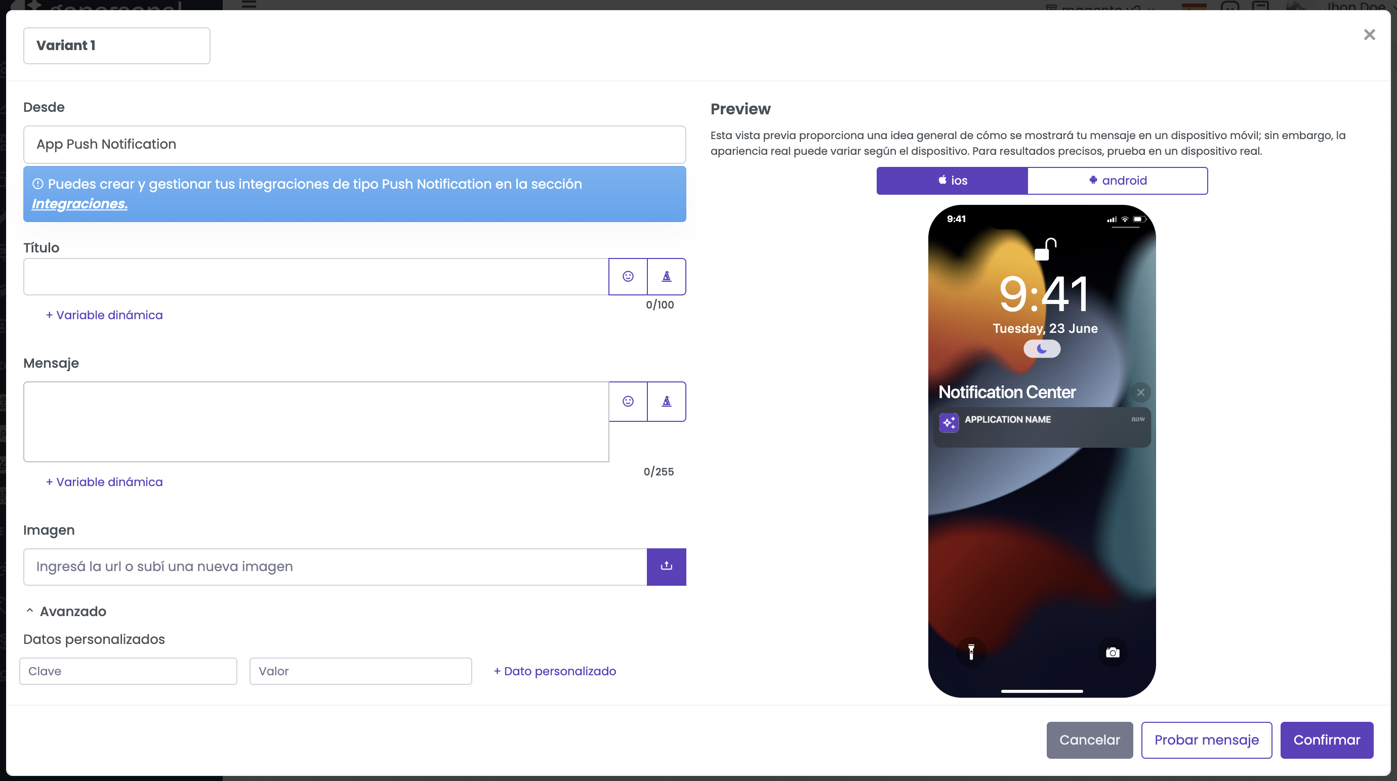 Para crear la variante es necesario ingresar la Integración mediante se realizará el envío, el titulo, mensaje, imagen, y datos personalizados que luego pueden ser utilizados desde la app.