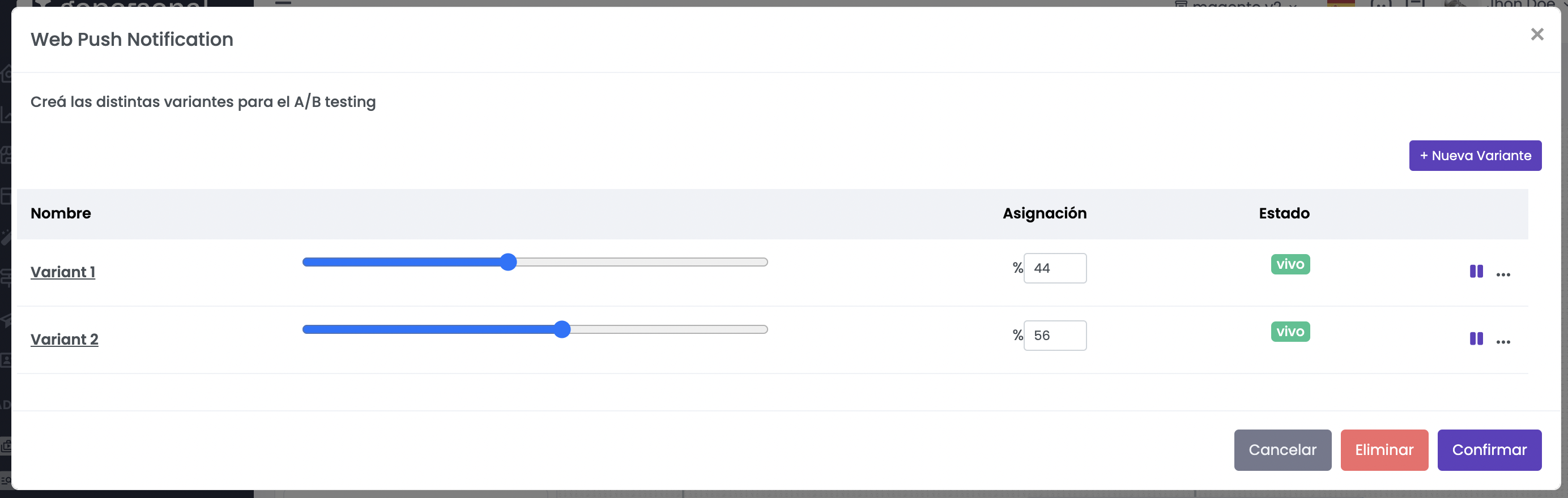 Es posible crear variantes para las pruebas A/B asignando la proporción de tráfico para cada una. Además, la variante se puede pausar o activar en cualquier momento según sea necesario.&#x20;