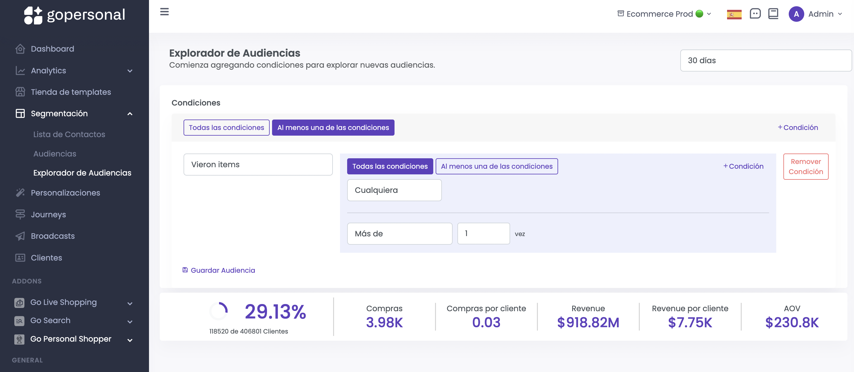 * [Comportamiento de compras](https://academy.gopersonal.ai/guia-de-usuario/segmentacion/audiencias/condiciones-de-audiencia/comportamiento-de-compras)